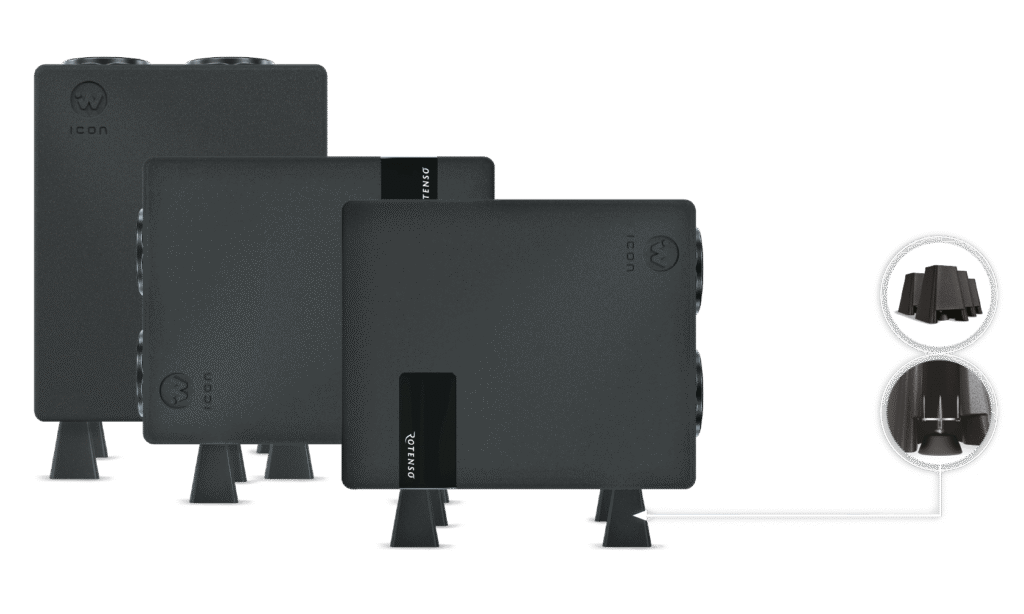 Zestaw montażowy iFOOT jest całkowicie uniwersalny i kompatybilnym z całym typoszeregiem rekuperatorów Rotenso Wentilo ICON. Daje możliwość zamontowania rekuperatora w pozycji stojącej oraz regulację jego wysokości. Zestaw składa się z 4 antywibracyjnych stóp montażowych wyposażonych we wbudowany amortyzator.